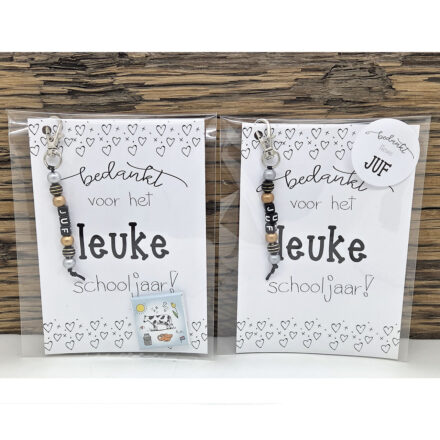 Bedankt juf cadeautje sleutelhanger. bestaat uit een wenskaart, sleutelhanger met juf en eventueel tegen meerprijs een lekker chocolaatje. Op de sleutelhanger staat het woord juf. De letterkralen hebben een grote van 6mm en de ronde kralen hebben een diameter van 8mm. Alle kralen zijn gemaakt van acryl. Dit is een soort kunststof. De haak van de sleutelhanger is 32mm groot.