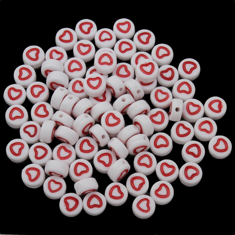 Ronde hartjes kralen zijn witte kralen met een open rood hartje. De kralen hebben een diameter van 7mm en zijn 4mm dik. De kraaltjes hebben een gat van ongeveer 0.9mm groot. Ze zijn erg geshcikt om te combineren met de ronde letterkralen. Deze kralen zijn er ook met een dicht hartje.